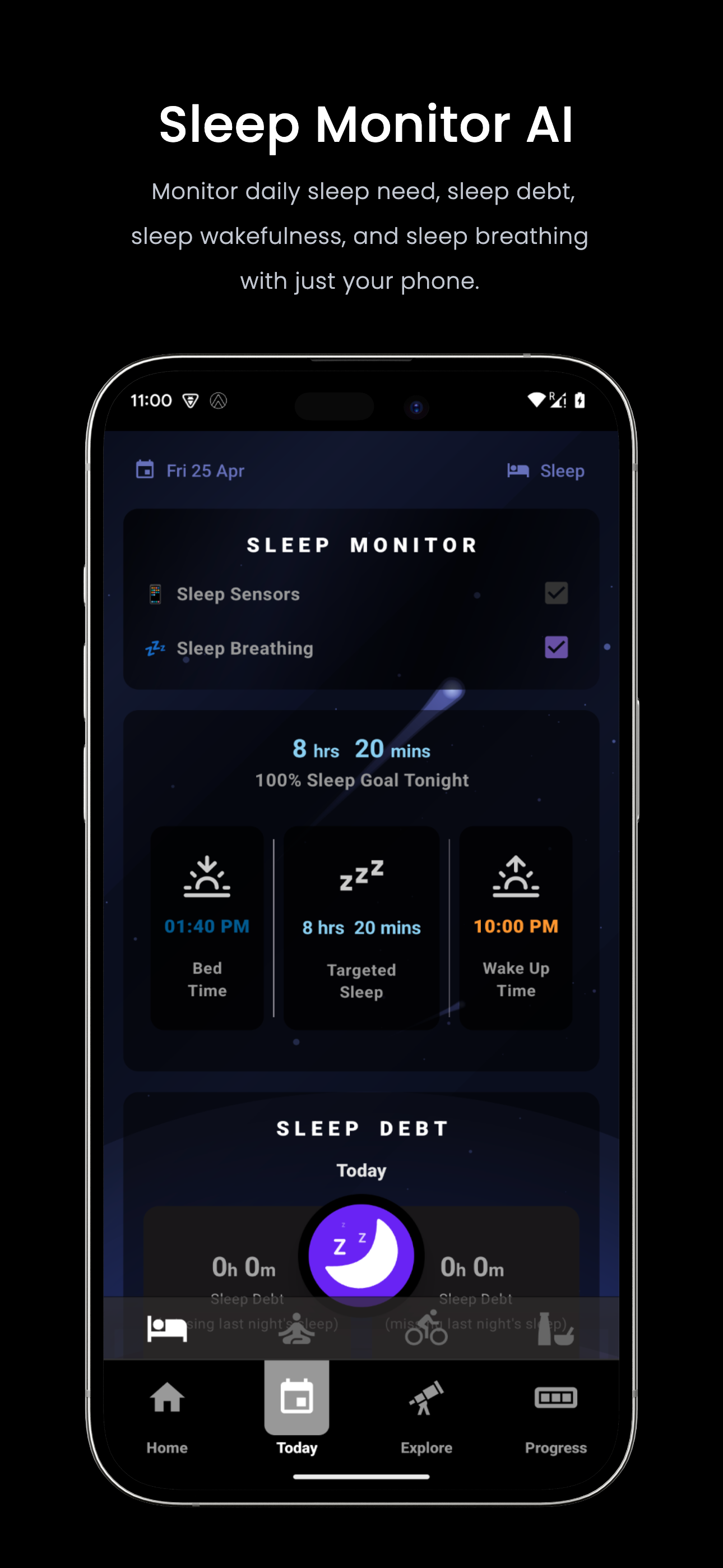 Our Sleep monitor works with just your phone — no extra devices needed. Our technology tracks sleep using tappigraphy (phone use patterns), actigraphy (physical movements and mattress motions), light sensing (room light tracking), and sleep breathing monitoring (via microphone).